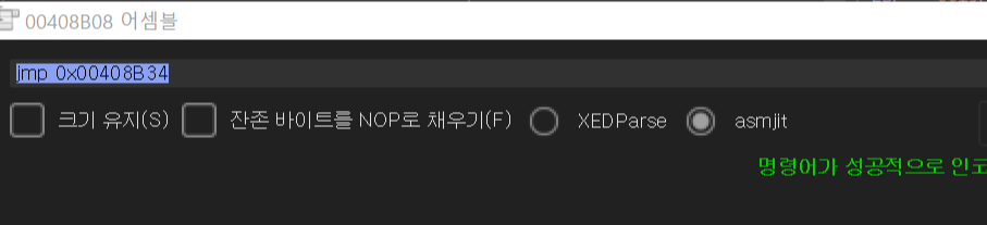 3번 패치에서와 같이 408B08 주소의 jl 명령어를 jmp로 바꿔주면 된다.