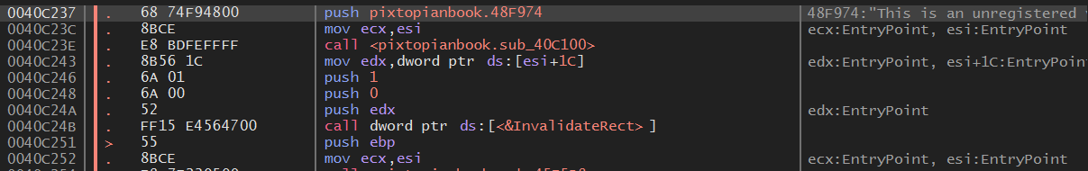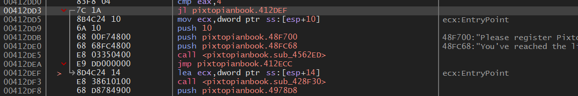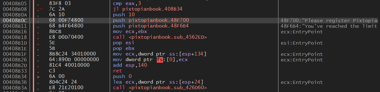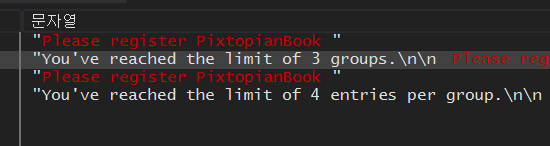 디버거의 참조 탭에서 "Please register PixtopianBook"을 검색해보면 위와 같이 나오는데 하나는 그룹을 3개 이상 생성하려고 할 때의 문자열과 다른 하나는 사람 정보를 4개 이상 생성하려고 할 때의 문자열이다.
