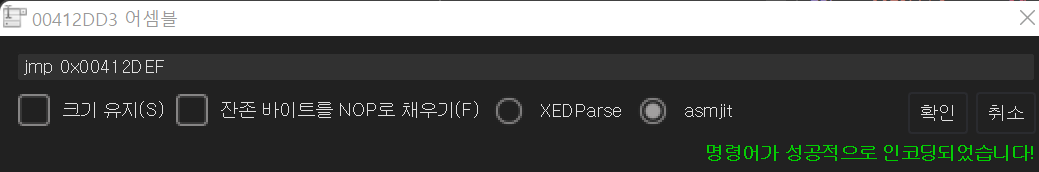 그렇다면 412DD3 주소의 명령어를 jl에서 jmp로 바꾸어 무조건 412DEF 주소로 점프하게 한다.