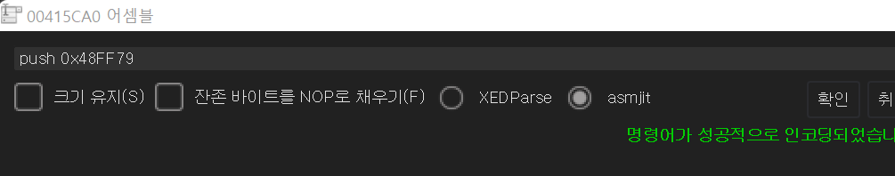 40c237 주소에서 48F974 주소에 있는 데이터를 스택에 넣는데 이 데이터는 패치 할 문자열이다.