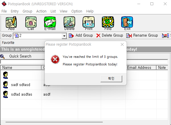 등록되지 않은 버전이라 그런지 왼쪽 상단의 "Add"를 눌러 사람의 정보를 추가하는 기능이 4개밖에 되지 않는다.