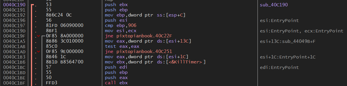 설치된 PixtopainBook 실행 파일이 위치한 곳으로 이동해 해당 실행 파일을 x32dbg에 로드한다.