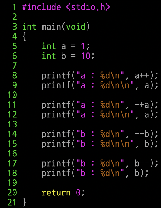 즉 8행에서 printf문의 내용은 변수 a를 먼저 사용하여 그 값을 출력한 뒤에 변수 a의 값을 1 증가시킨다는 의미이다.