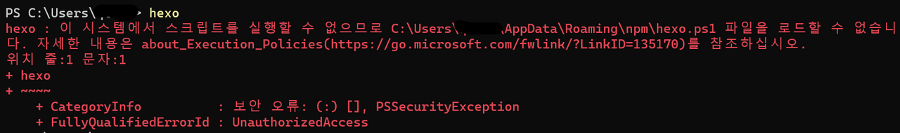 github blog를 위해 hexo를 사용하는데 node.js 설치 후 hexo를 설치했음에도 hexo가 실행이 되지 않고 위와 같이 뜬다.