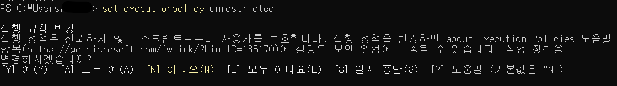 뭔가 인증되지 않은 접근이라길래 관리자 모드로 powershell을 실행해서 해봐도 실행이 되지 않았다.