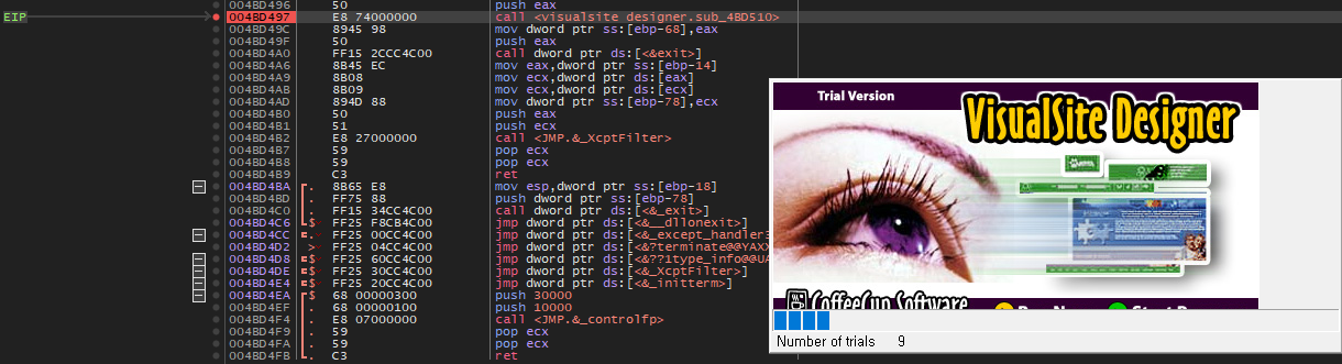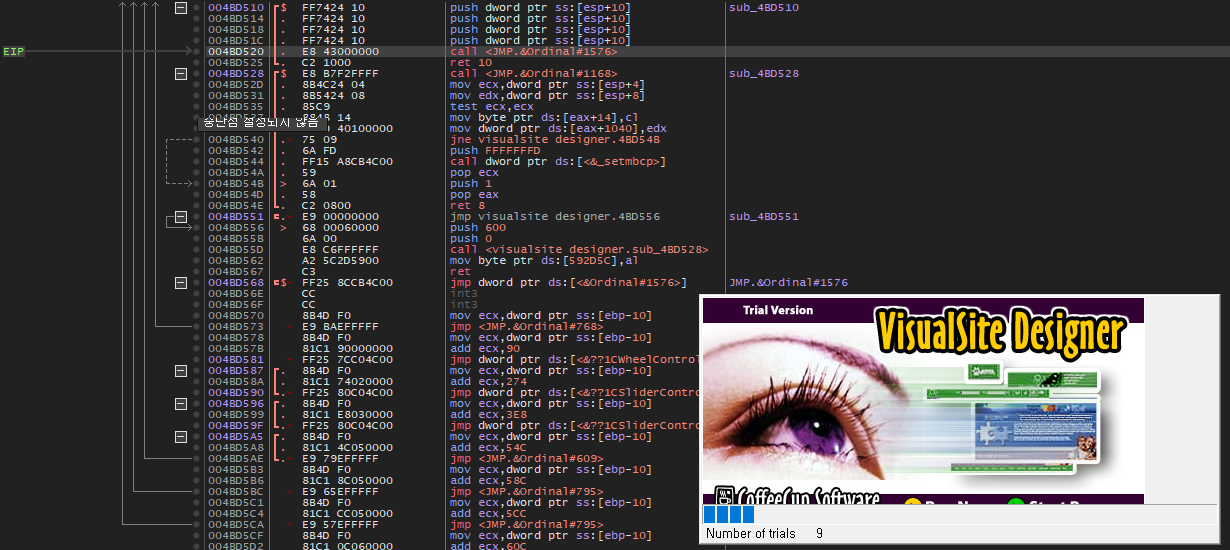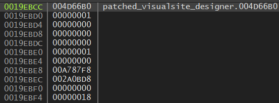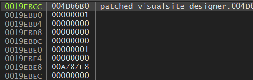 70000000 번대 주소는 dll 파일의 영역이지만, 400000 번대 주소는 Visualsite Designer 프로그램의 영역이다.