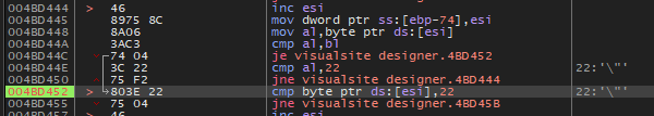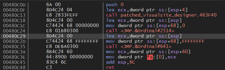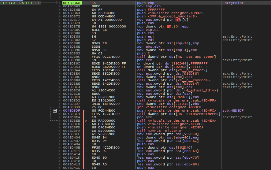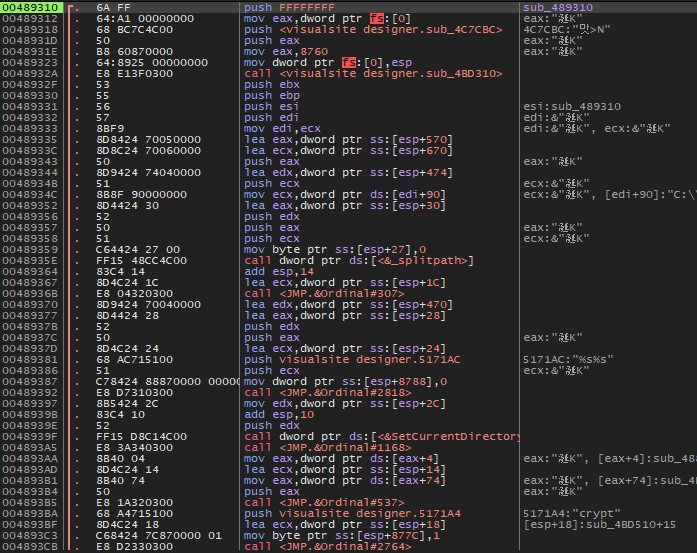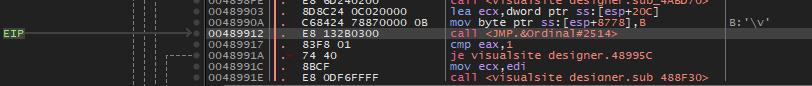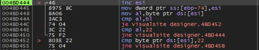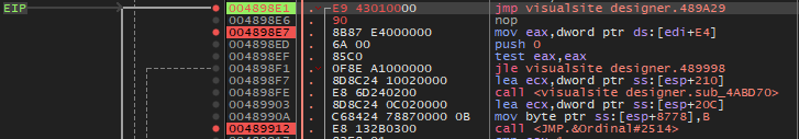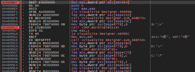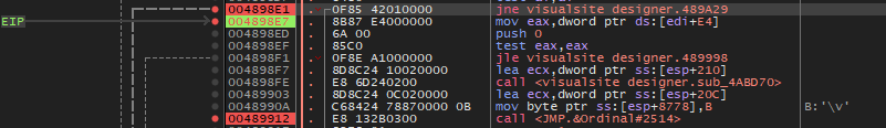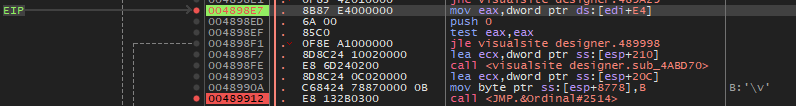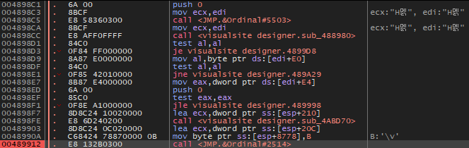 대쉬('-') 키를 눌러서 이전 어셈블리어 코드로 돌아가다 보면 위와 같이 489912 주소가 마지막 Visualsite Designer 영역이다.