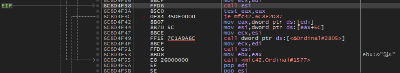 계속해서 F8 키로 진행하다보면 위와 같이 6C8D4F38 주소에서 esi에 있는 어떠한 함수를 호출함으로써 프로그램이 시작된다.