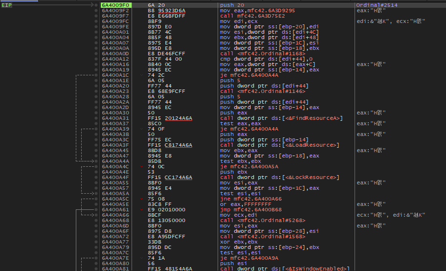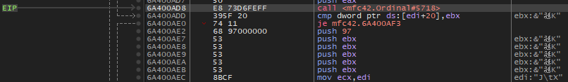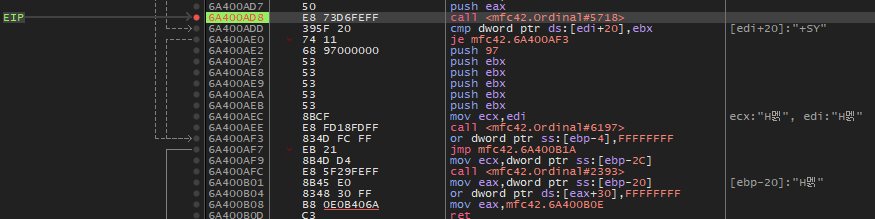 Ctrl + F8 키로 진행하다보면 위와 같이 6A400AD8 주소에서 멈춘다.