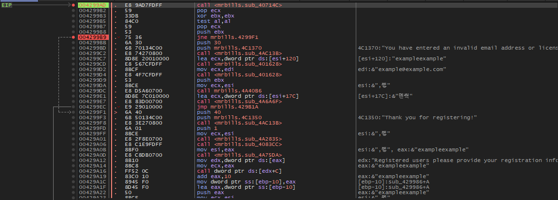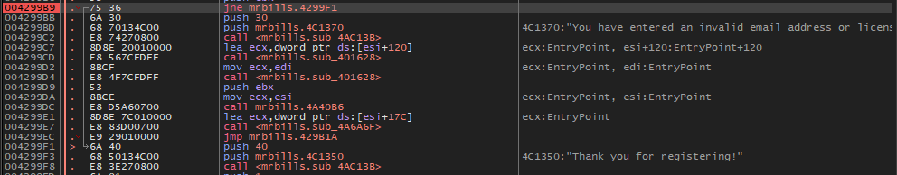 같지 않으면 4299F1 주소로 점프하여 "Thank you for registering!" 문자열을 띄우고