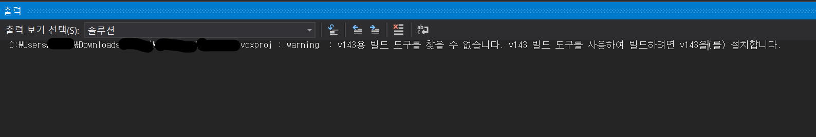 Visual Studio 2022에서 빌드했던 프로젝트를 Visual Studio 2019에서 빌드하려니 위와 같이 "위와 같이 v143용 빌드 도구를 찾을 수 없습니다. v143 빌드 도구를 사용하여 빌드혀려면 v143을 설치합니다." 문구가 뜬다.