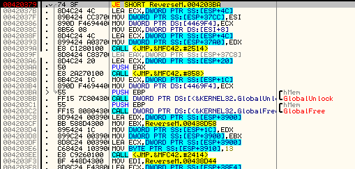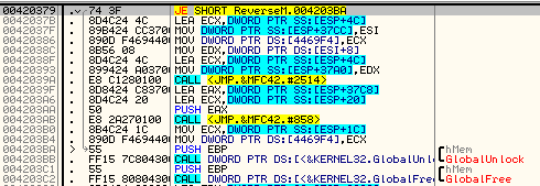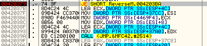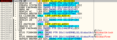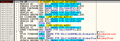 42039A 주소로 간 후 스크롤을 조금 위로 올려보면 420379 주소에 JE 명령이 있다.