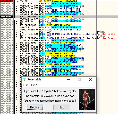 420379 주소에서 조건 분기가 수행되어야 Nag 창이 안 뜨는데, 그렇게 하면 Register 버튼이 있는 메인 창도 안 뜨게 된다.