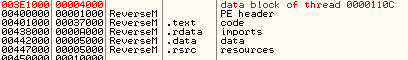 ollydbg의 상단에 있는 애메랄들 아이콘들 중 M 버튼을 눌러 memory를 보면 위와 같이 ReverseMe 파일의 메모리 영역이 보이는데 이 중 .data 영역을 더블 클릭하여 이동한다.