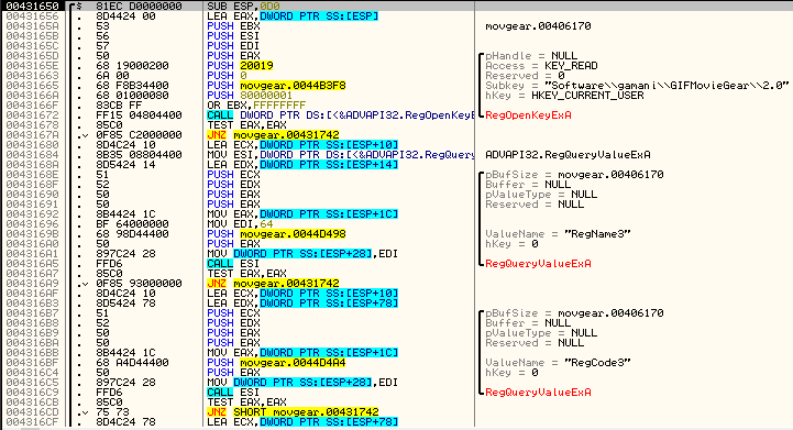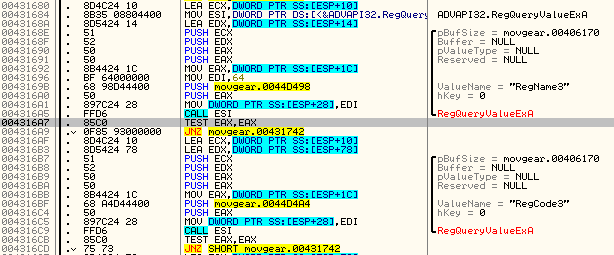 어쨌든 현재 프로그램이 등록되지 않은 상태에서는 RegOpenKeyExA 함수와 RegQueryValueExA 함수의 결과가 모두 431742 주소로 점프하도록 되어 있고