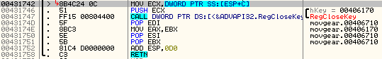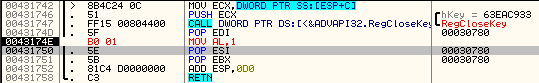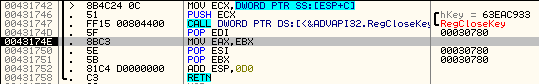 RegCloseKey()를 호출 후 eax에 ebx의 값을 담은 뒤 함수를 종료한다.