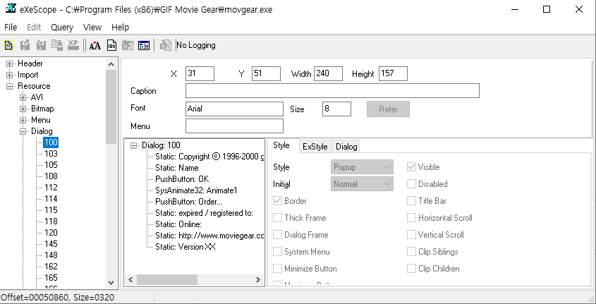 리소스 편집 프로그램인 exescope를 이용해 movgear 프로그램의 리소스를 확인하면 위와 같이 Resource -> Dialog에서 ID가 100인 대화 상자를 보면 프로그램을 종료할 때 봤던 문구가 그대로 적혀있다.