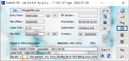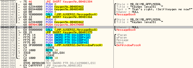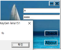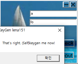 시리얼 키가 생성되는 것은 사용자가 첫 번째 텍스트 박스에 입력한 값에 따라 달라지는데, 두 번째 텍스트 박스에 입력된 값과 암호화 연산이 끝난 후의 값이 같지 않으면 에러 메세지 창이 뜬다.