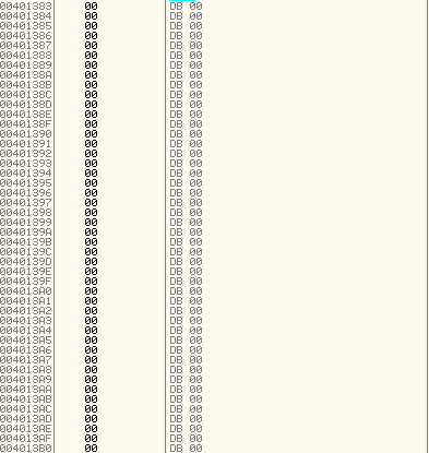 그리고 code cave를 설치할 공간을 찾아야 하는데 에러 메세지 창을 띄우는 부분에서 스크롤을 조금 내리다보면 401383 주소부터 4013B0 주소까지 00으로 채워진 것을 확인할 수 있다.