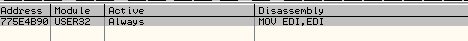 Alt + b 키를 눌러 BP들을 확인했을 때 위와 같이 775E4B90 주소에 있는 mov EDI, EDI 주소에 BP가 걸린다.