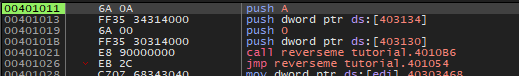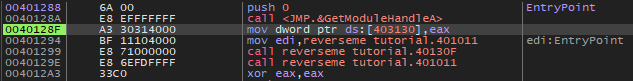 이 400000 값은 403130 주소에 저장하고, edi 레지스터에 401011주소를 저장한 다음 40130F 주소의 함수를 호출한다.