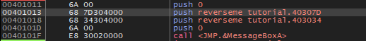 40101F 주소에서 messagebox() 함수를 호출하는데 인자값 부분의 값들이 어떤 문자열들인지 안 보이는 것으로 보아 아직 복호화가 덜 됐다는 걸 알 수 있다.