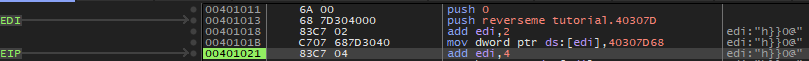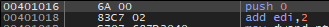 그리고 edi 레지스터 값에 2를 더함으로써 edi 레지스터에는 401013 주소가 담겨있게 된다.