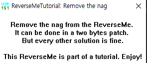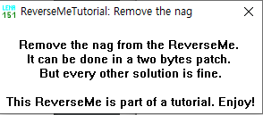 4012BD 주소에서 MessageBoxA 함수를 호출하는데 인자로 2byte를 패치해서 Nag를 없애라는 문자열이 있다.