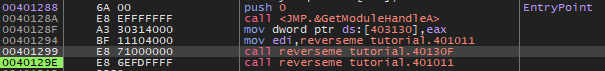 40128A 주소에서 GetModuleHandleA() 함수를 호출한 뒤 반환값이 eax에 담기는데 400000 이라는 값이 들어있다.