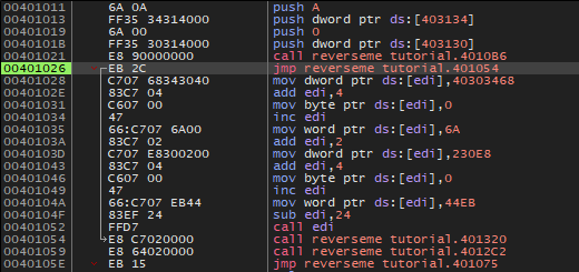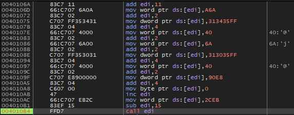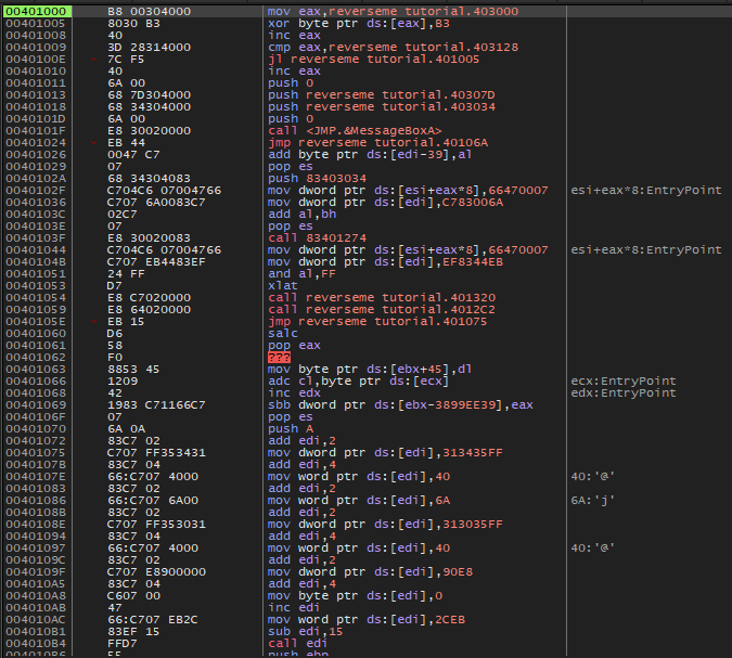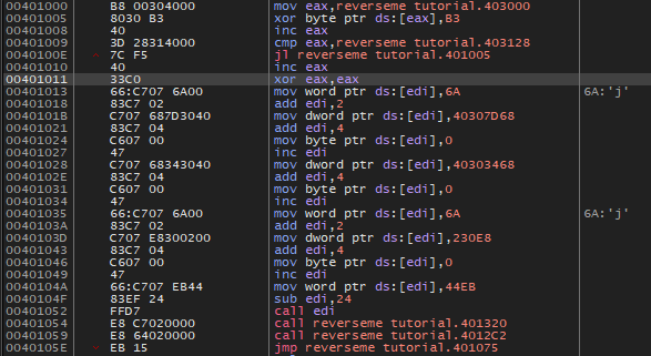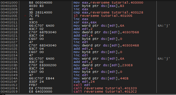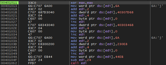 먼저, xor 연산으로 eax 레지스터의 값을 0으로 초기화하고, edi 레지스터에는 401011 주소가 담겨있는데 401011 주소에서 2byte 데이터에 6A를 저장한다.