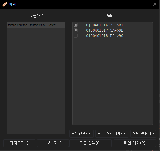 위와 같이 모두 선택 해제 해준 뒤 Ctrl 키를 누른 상태에서 401016, 401017 주소만 선택하고 파일 패치 버튼을 눌러 파일로 저장한다.