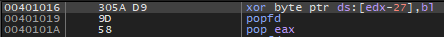 401314 주소부터 40131D 주소까지가 401000 주소 ~ 401218 주소에 있는 암호화 된 바이트 코드를 대상으로 xor 연산으로 복호화 하는 루프이고, 이 루프를 Decrypting 루프라고 한다.
