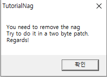 2byte를 패치해서 Nag를 없애라는 문구와 nag 창에서 봤던 문구가 보인다.