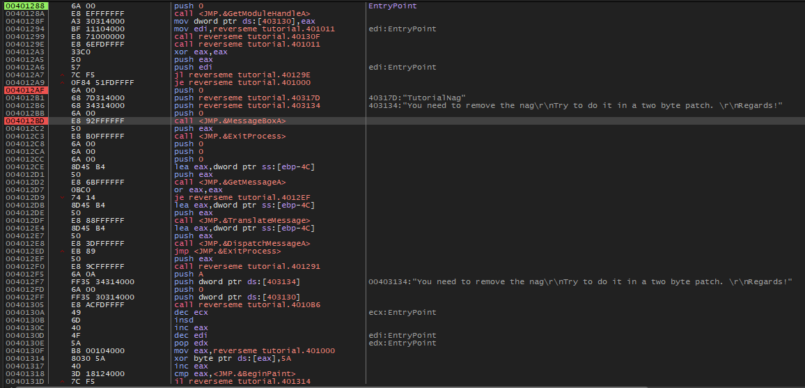 위의 사진에서 4012AF 주소부터 스택에 인자값들을 넣고 4012BD 주소에서 MessageBoxA() 함수를 호출하는데 이 부분이 우회 코드이다.