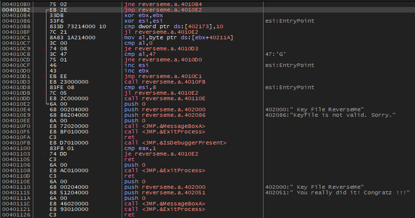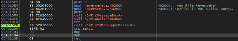 그렇다면 4010FB 주소의 함수 내에서 IsDebuggerPresent 함수의 결과가 1이면, 즉 디버깅 중이면 401103 주소에서 4010E2 주소로 점프하고, keyfile is not valid. Sorry 문자열을 띄우는데