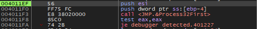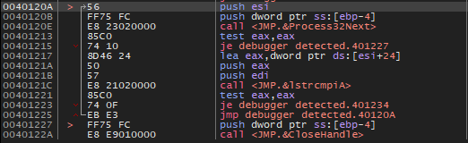 이 함수의 결과로 성공적으로 프로세스를 가져왔다면 lstrcmpiA 함수로 비교한 뒤 같으면 401234 주소로 점프하여 디버거가 탐지되었다는 메세지 창을 띄우고, 같지 않으면 40120A 주소로 점프하여 Process32Next 함수를 다시 호출한다.