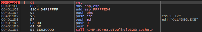 즉, 위의 루프에서는 스냅샷 된 프로세스 목록에서 OLLYDBG.EXE 문자열과 일치한 프로세스가 나올 때까지 프로세스 정보를 가져와 비교한다.