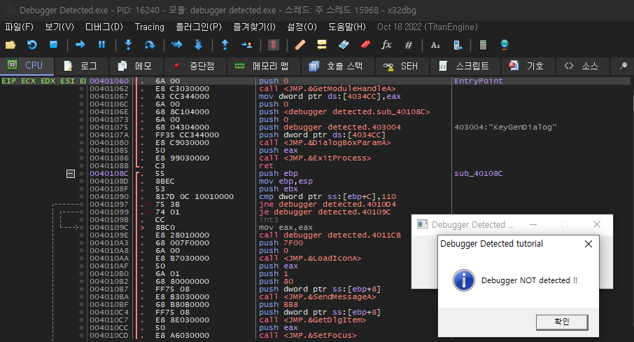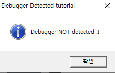 디버거에 올린 후 F9 키를 눌러 실행해봤는데 위와 같이 디버거가 탐지되지 않았다고 뜬다?