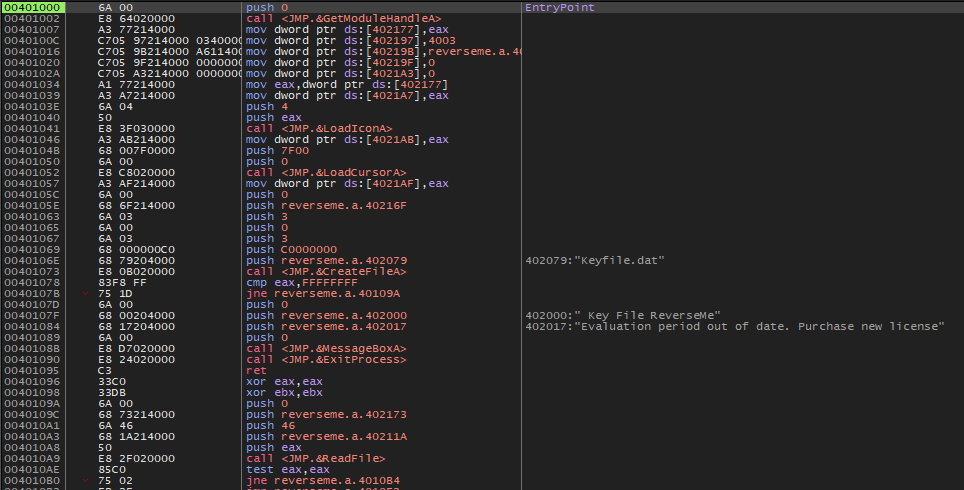 401073 주소에서 CreateFileA() 함수를 통해 keyfile.dat 파일이 있는지 검사한다.