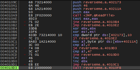 40109A 주소로 점프한 후 4010A9 주소에서 ReadFile 함수를 호출한다.
