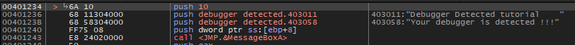 비교 결과가 일치하면 401234 주소로 점프하여 디버거가 탐지되었다는 메세지 창을 띄운다.