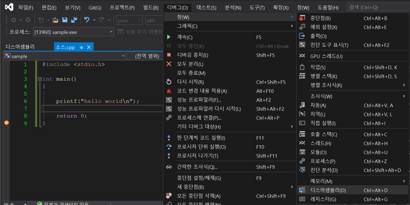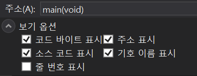 2. 중단점 하나를 설정하고 F5키를 누르고, 디버그 메뉴 -> 창 -> 디스어셈블리 한 후 보기 옵션에서 코드 바이트 표시 체크