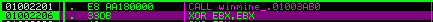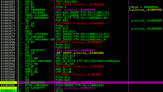 그렇다면 지뢰찾기 프로그램에서 1로 표시된 자리의 왼쪽 자리인 1,1 좌표의 블럭을 두 번 연속으로 누르고 두 번째 WM_LBUTTONUP 메시지가 발생할 때 까지 F8 키와 F9를 누른 뒤 두 번째 WM_LBUTTONUP 메시지가 발생했을 때 다시 분석을 한다.