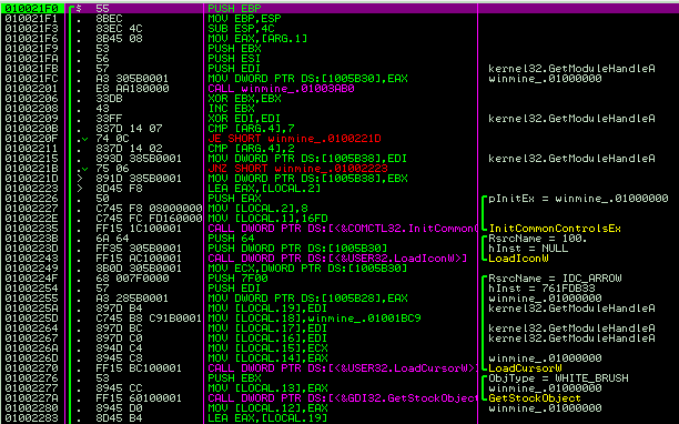 F8 키를 눌러 진행하다보면 100230F 주소에서 CreateWindowExW() 함수를 호출한다.