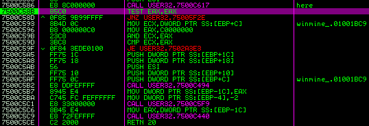 가장 빠른 방법은 WndProc() 부분인 1001BC9 주소에 BP를 걸고 F9 키를 눌러 한번에 가는 것이지만, F8 키로 진행하며 따라간다.