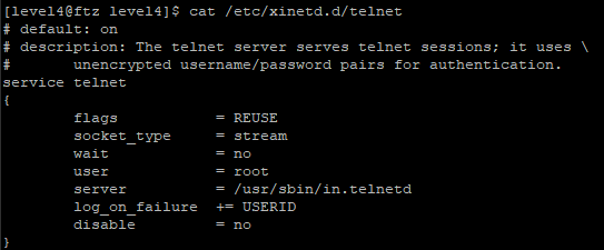 /etc/xinetd.d/backdoor 파일의 내용에서 finger 서비스로 요청이 들어오면 level5 계정의 권한으로 /home/level4/tmp/backdoor 프로그램을 실행한다고 되어있었다.