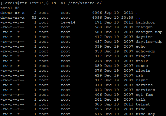 여러 네트워크 서비스 데몬의 설정 파일들이 있는데 이 중 backdoor 이라는 이름으로 그룹 권한이 level4인 파일이 있다.