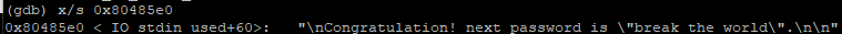 비교해서 같으면 "Congratulation! next password is "break the world"." 문자열을 띄우고 종료한다.