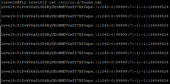 /etc/rc.d/found.txt 파일은 root 계정과 level8 계정만 읽을 수 있고, root 계정만 쓰기까지 가능하다.