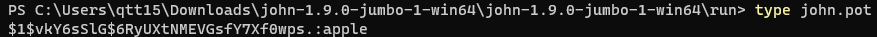 .\john.exe --format=md5crypt --wordlist=password.lst pass.txt